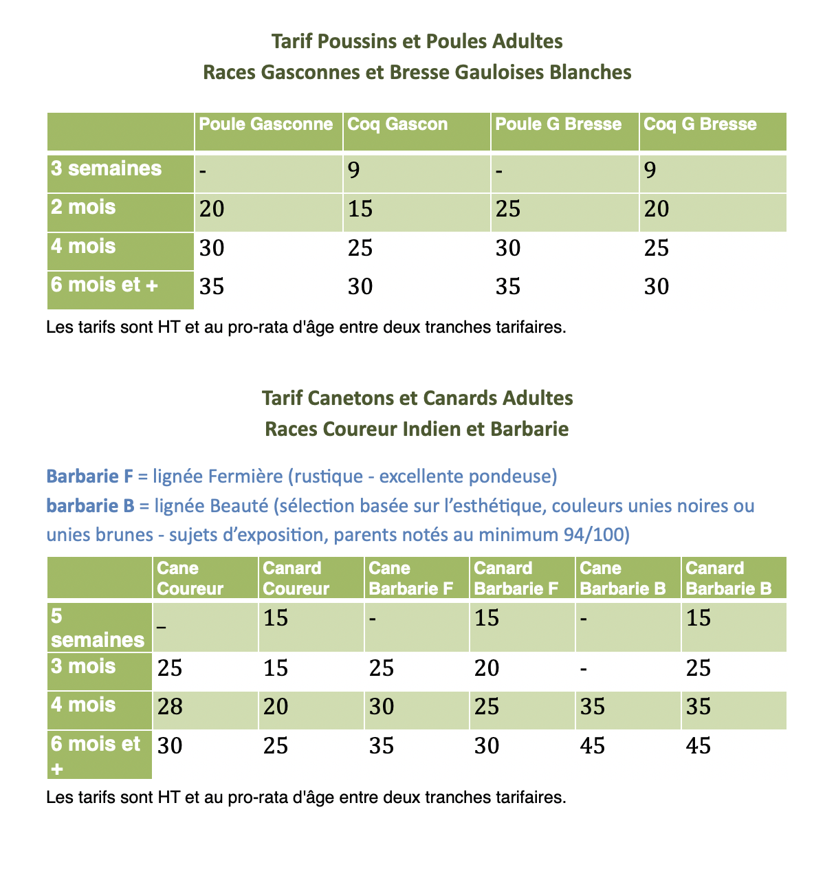 Tarifs 2026 - Canards, Poules, Oies